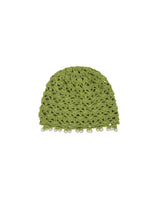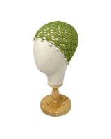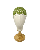Handcrafted lime green wool bonnet adorned with delicate pearls.