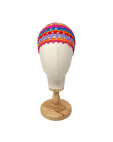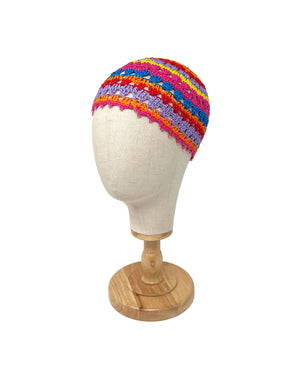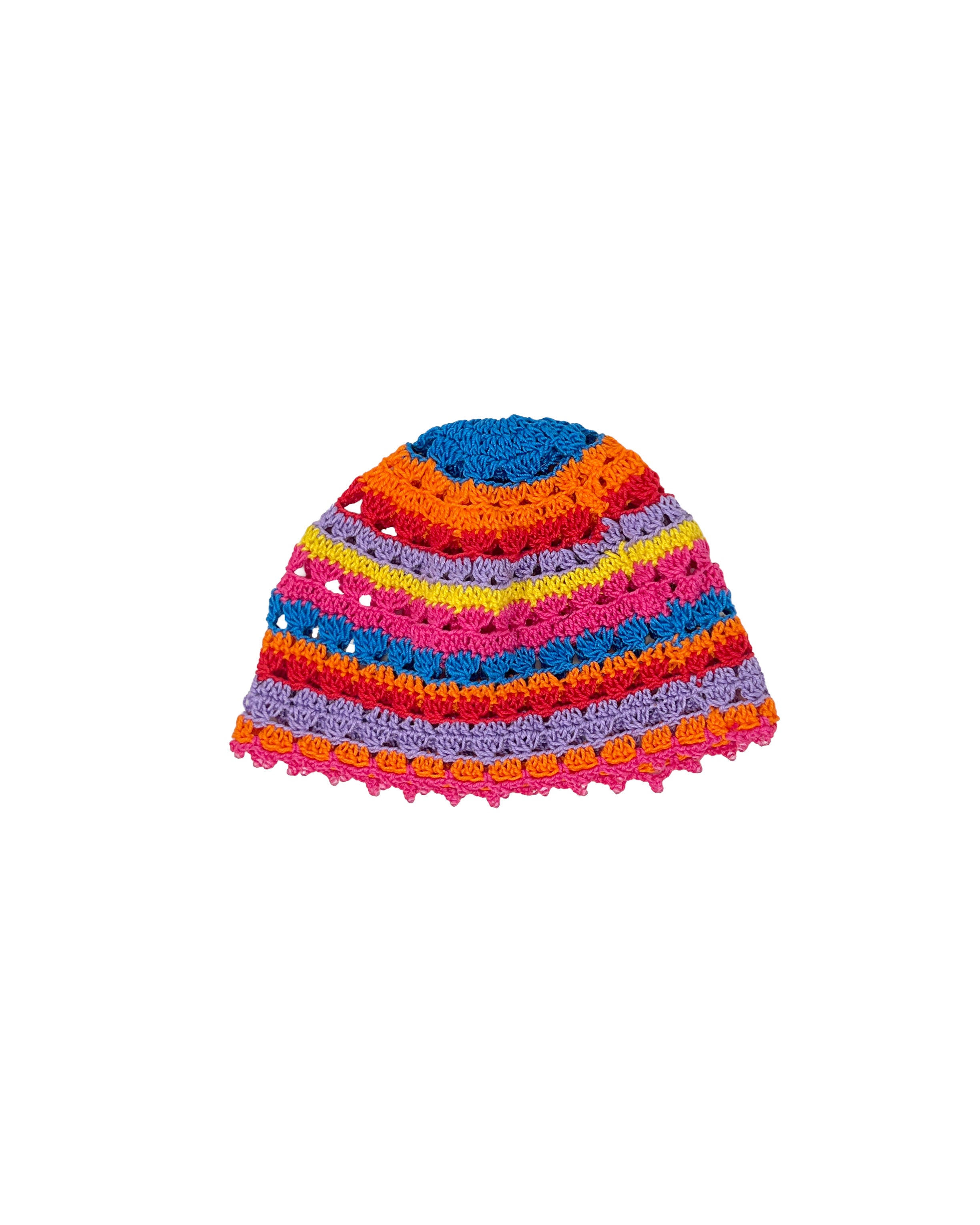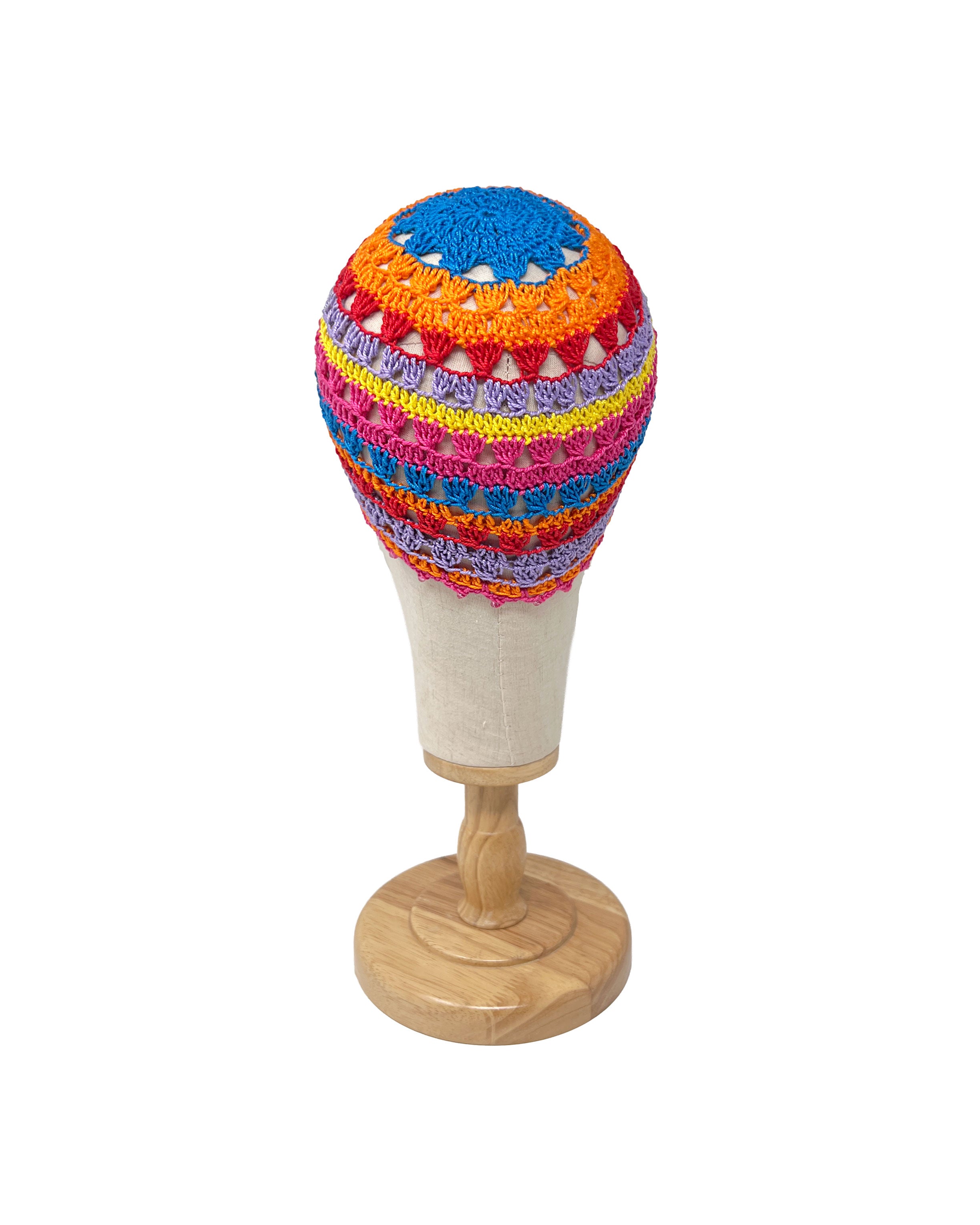This multicoloured crocheted bonnet hat is a charming accessory that combines vibrant hues with delicate craftsmanship.