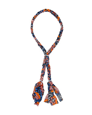 The “Ibiza” boho necklace is a distinctive accessory blending elegance with a carefree vibe. Crafted from fabric featuring vibrant orange, blue, and black patterns, it evokes the spirit of Mediterranean summers.